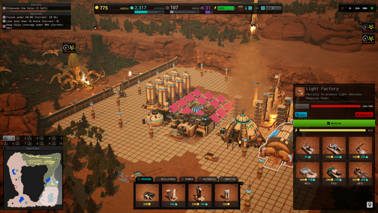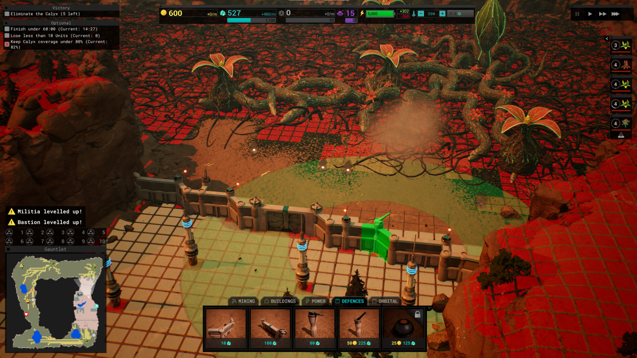 Геймплей Calyx сочетает динамичную RTS, строительство базы и элементы tower defense с уникальной механикой «живого врага». Calyx распространяется по карте как настоящая инфекция — растёт, мутирует, поглощает ресурсы и атакует ваши позиции. Вам предстоит добывать редкие минералы, возводить мощные турели, создавать мобильные отряды, резать корневые системы, уничтожать узлы и вызывать цепные взрывы органики. Каждая карта — новый вызов: пустынные каньоны, подземные пещеры, токсичные равнины — везде Calyx адаптируется и становится сильнее.