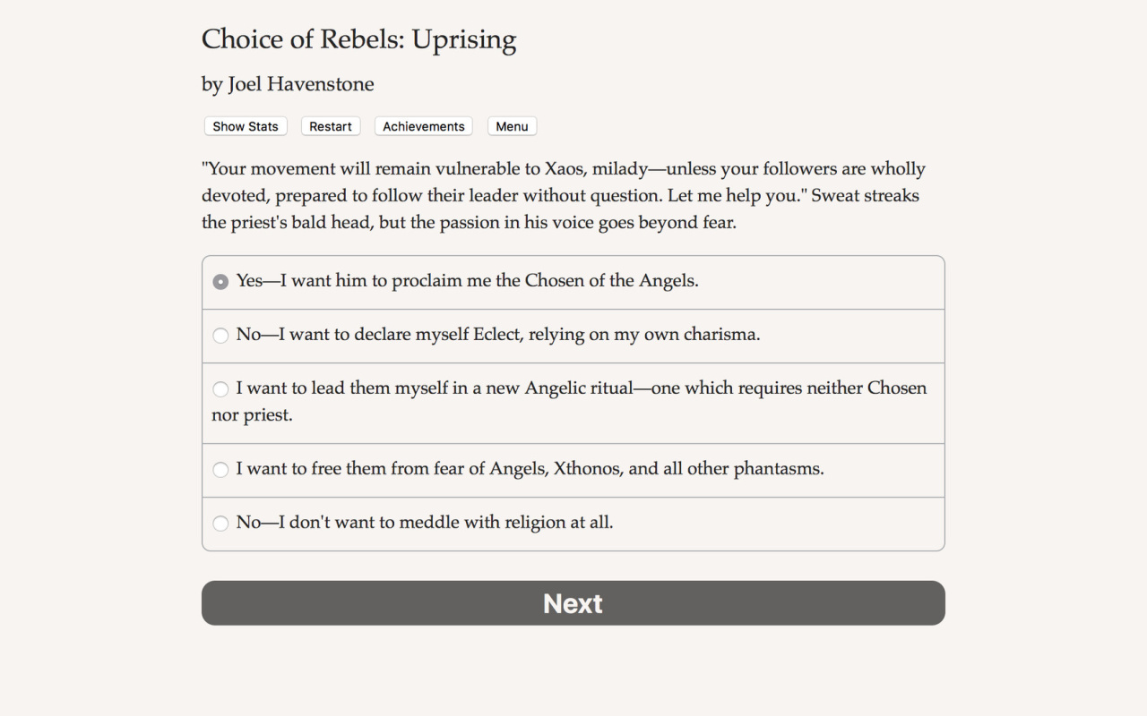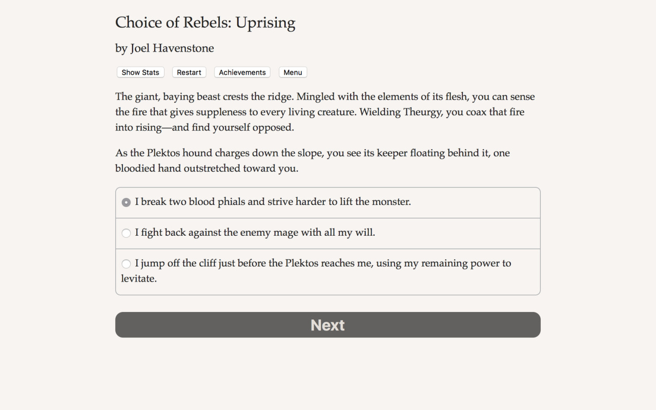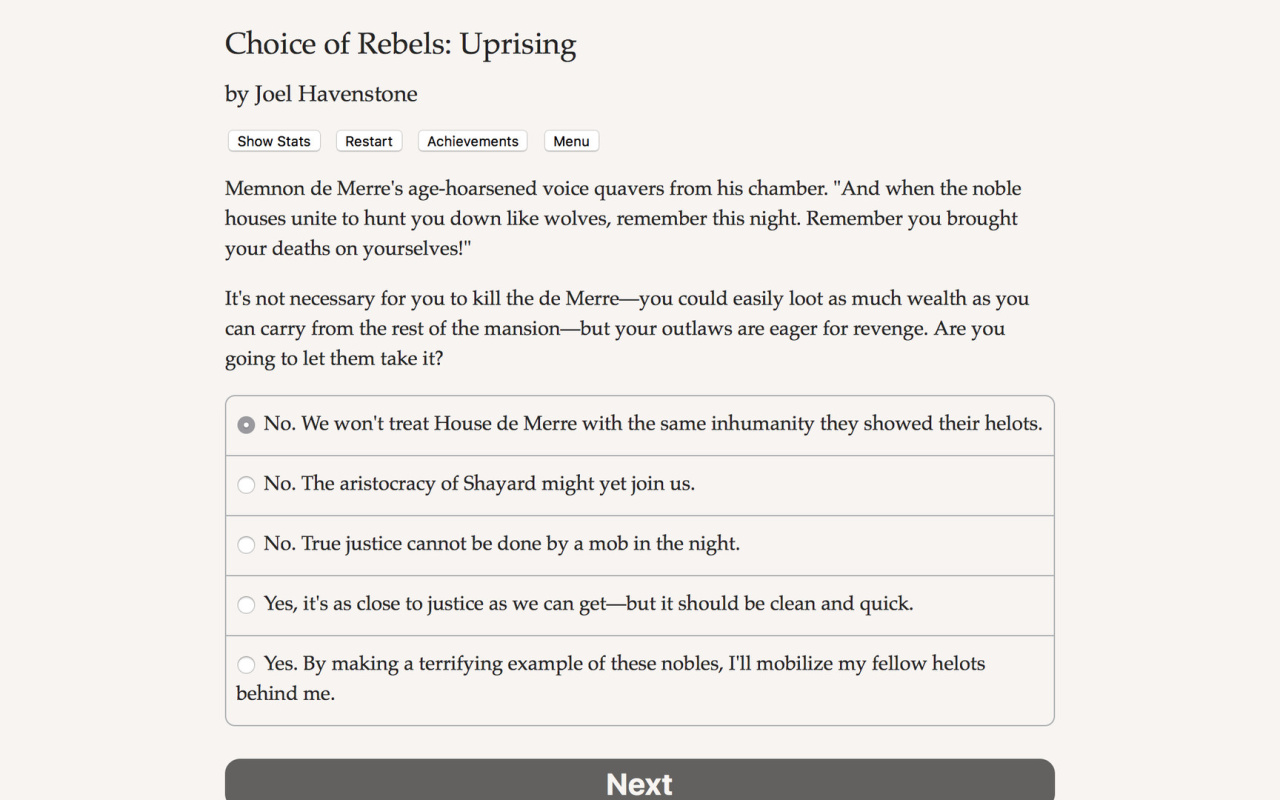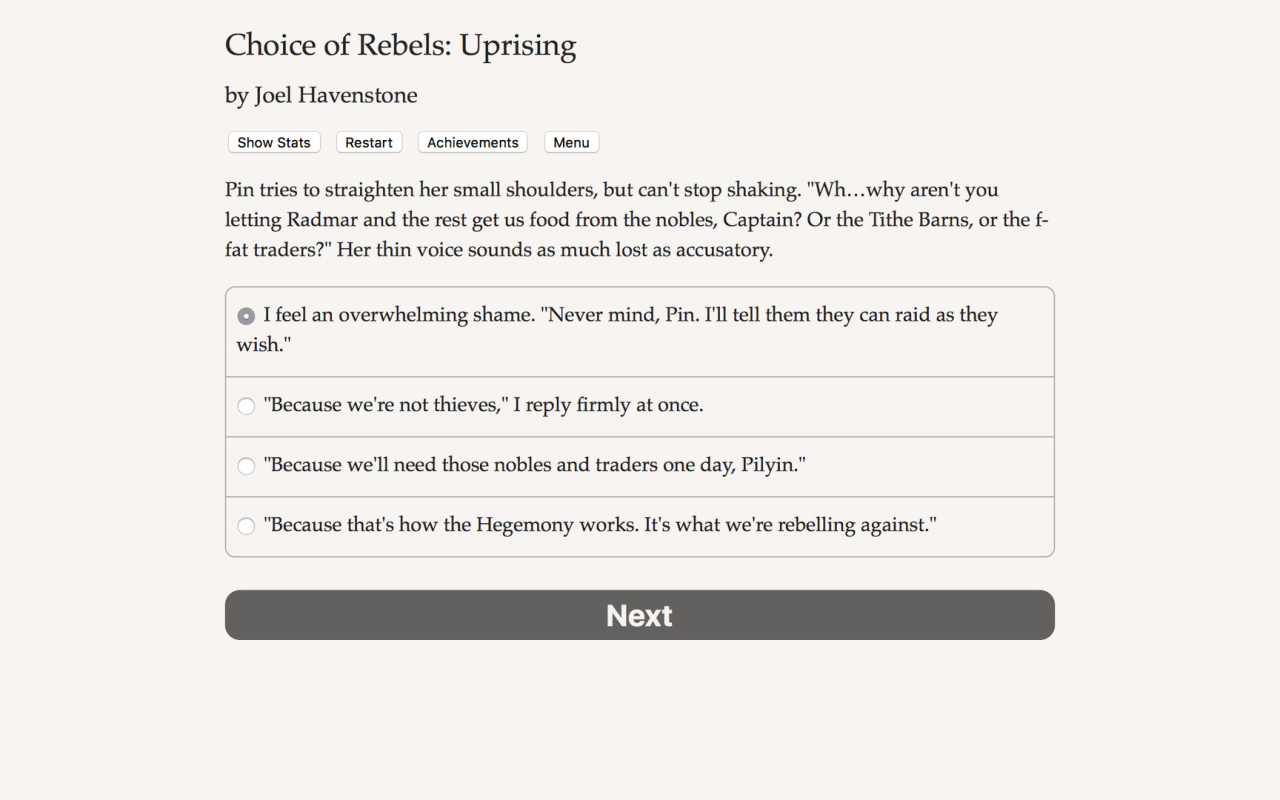 Choice of Rebels: Uprising игра для ПК скачать торрент — текстовая интерактивная новелла на движке ChoiceScript с глубочайшей проработкой. Статистика: харизма, интеллект, бой; репутация, идеология. Стратегические битвы, где тактика решает всё. Нет графики и озвучки — чистый текст усиливает атмосферу голода, предательств и надежды. Работает на любом ПК, идеально для фанатов глубоких историй.