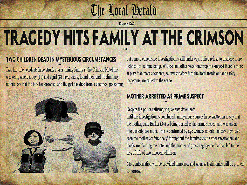 Crimson Hotel — это атмосферный survival horror с кооперативом от Spire Interactive, вышедший в 2019 году. История начинается в 1949 году: два жутких инцидента в роскошном отеле Crimson привели к несправедливому обвинению матери Джейн Баркер в убийстве своих детей. После освобождения в 1954 году она исчезла, а отель был заброшен. Теперь, спустя годы, группа подростков возвращается с вечеринки, машина ломается прямо у входа в старый Crimson Hotel. Ночь, тьма, никого вокруг — и единственный шанс на помощь внутри проклятого здания.