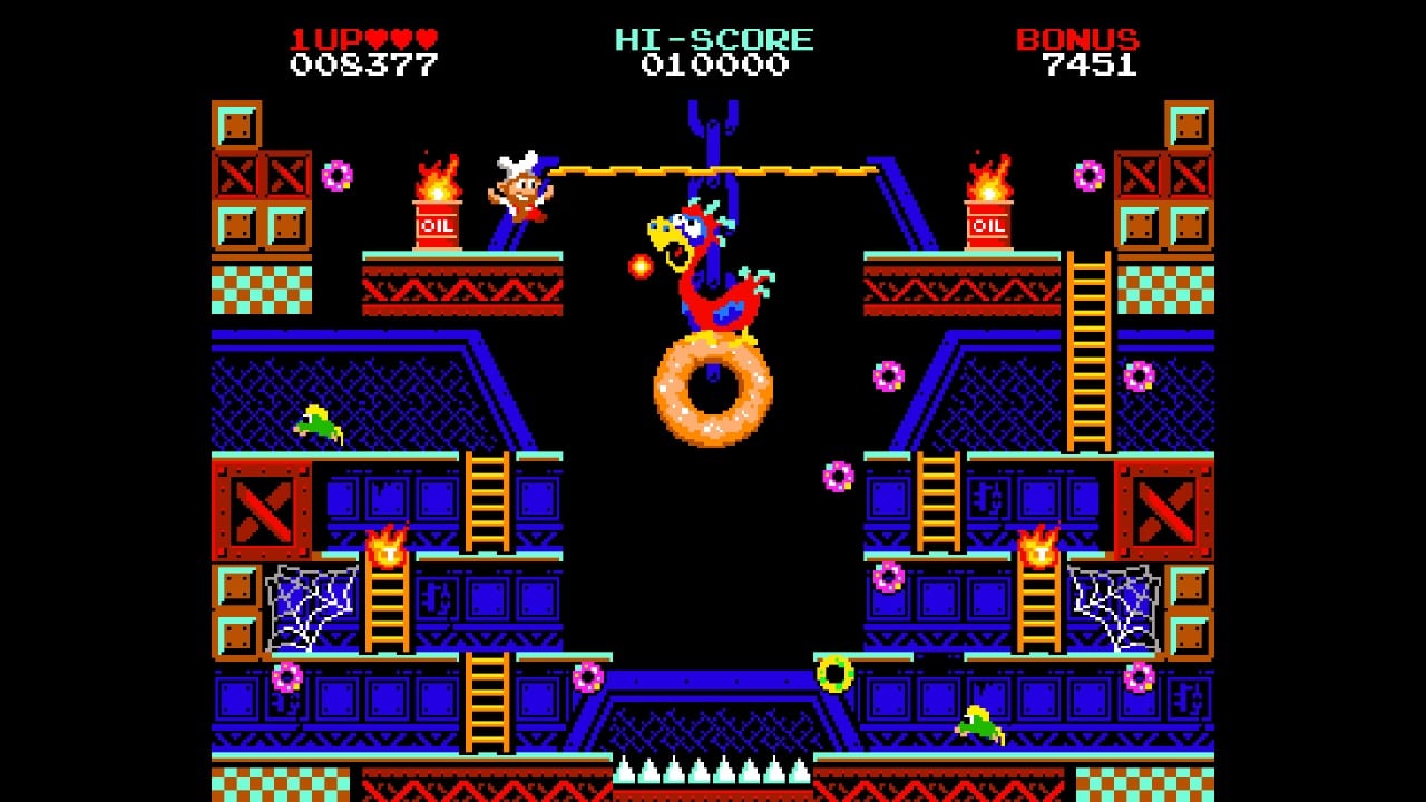Геймплей Donut Dodo игра для ПК — чистый адреналин и вызов: бегайте, прыгайте, карабкайтесь по лестницам и канатам, избегайте врагов и ловушек. Нет оружия — только мастерство и точность! 5 уникальных уровней + бонусный этап (каждый с собственной механикой: падающие балки, конвейеры, кипящее масло, преследующие противники). Собирайте пончики быстро для бонусов, фрукты для доп.очков, бейте рекорды в таблице лидеров с 3-буквенными инициалами. Управление идеально точное, без дешёвых смертей — каждый рестарт учит лучше. Donut Dodo скачать торрент на русском — и часы хай-скор чейзинга гарантированы!