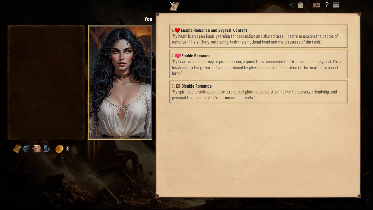 Erannorth Renaissance — текстовая игра-книга с открытым миром и sandbox-элементами, где вы создаёте героя с нуля: выбираете расу, класс, черты характера, навыки и предысторию, которые радикально влияют на геймплей и сюжет. Начинайте как мастер интриг Eric или оккультистка Diana, либо создайте полностью кастомного персонажа — от воина до мага и вора.