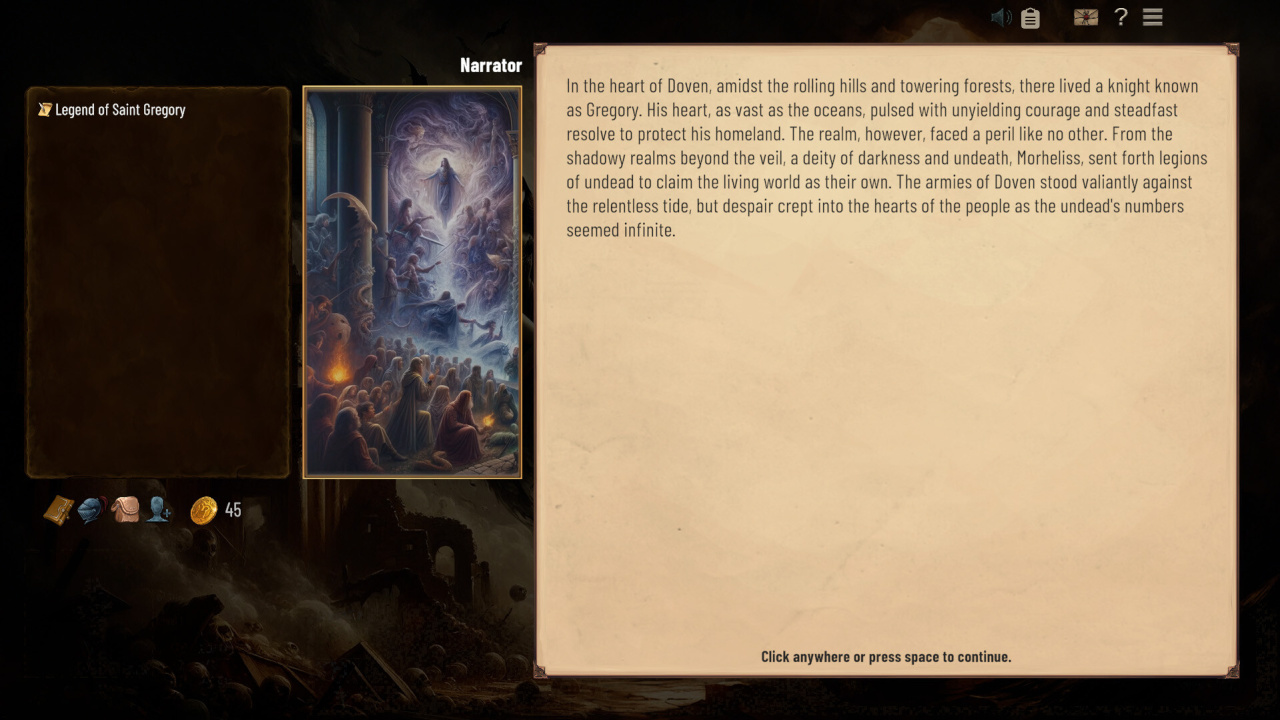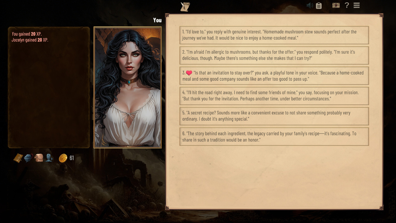 Атмосфера погружает полностью: тысячи строк текста, детальные описания городов, руин, лесов, подземелий и магических академий. Локации полны случайных событий, встреч и опасностей. Графика — стильные иллюстрации, атмосферные портреты и минималистичный, но красивый UI, который не отвлекает от повествования. Саундтрек ambient усиливает immersion в этой текстовой эпопее.