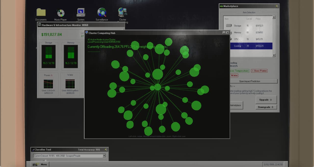 Геймплей сочетает idle-механики и менеджмент ресурсов: покупайте новые датасеты, улучшайте процессоры и охлаждение, следите за перегревом, нанимайте сомнительных помощников, балансируйте между доходом и рисками отключения электричества или вмешательства властей. Несколько концовок, скрытые события, текстовые сообщения и выборы, влияющие на судьбу мира.