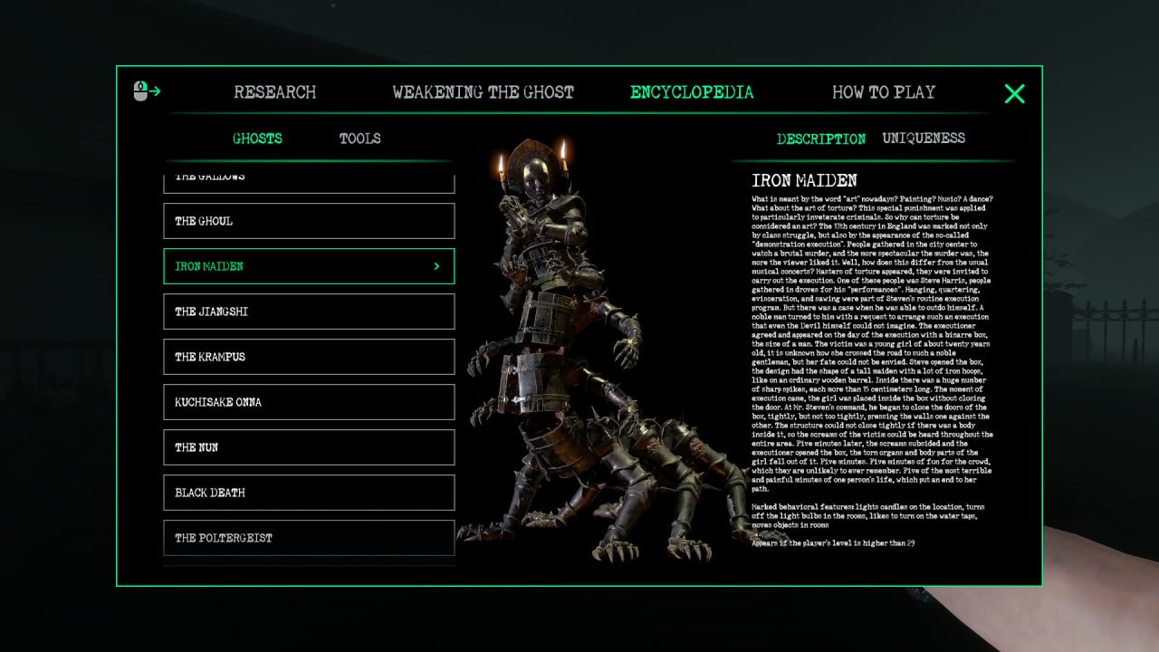 Сюжет строится вокруг контрактов: ваша команда охотников за привидениями расследует haunted места, определяет тип призрака (более 20 видов — от человеческих душ до демонов и ведьм вроде Yellow King), собирает доказательства инструментами (EMF, термометр, UV-фонарь, духи, соль, кресты), ослабляет духа и ловит его в ловушку! Кооп до 4 игроков, кастомизация, прокачка, модификаторы сложности (темнота, агрессия, проклятия) — геймплей глубокий и напряженный. Звук атмосферный: шаги, шепоты, крики — все усиливает immersion без озвучки персонажей.