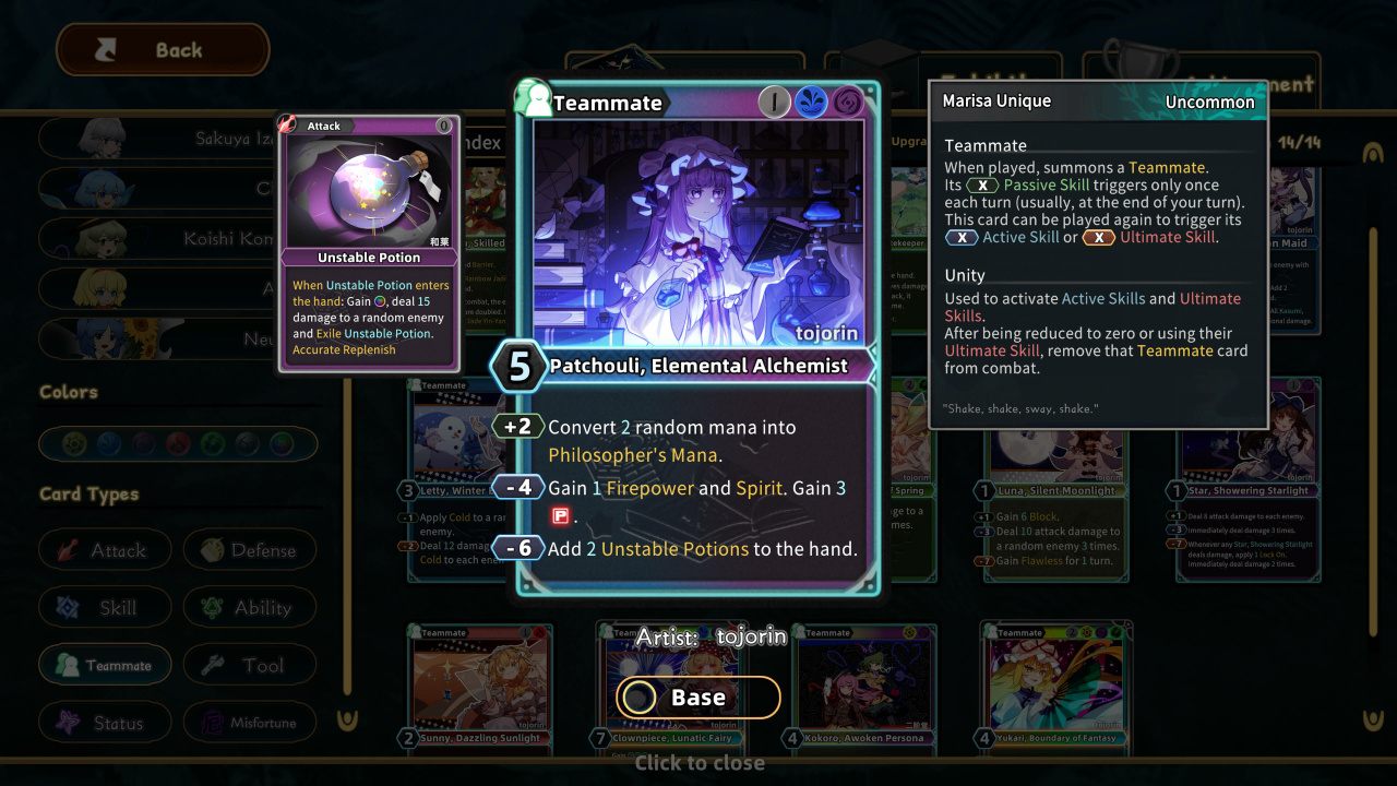 Геймплей Lost Branch of Legend скачать бесплатно предлагает уникальную систему цветной маны: красный для агрессии, белый для защиты, синий для контроля, черный для некромантии, зеленый для роста. Собирайте карты, находите Shining Exhibits для перманентного усиления маны, комбинируйте цвета для разрушительных комбо. Выбирайте персонажей с разными стилями — от балансной Рейму до хаотичной Койши. Бои стратегические: планируйте ходы, используйте инструменты, спеллкарты и реликвии, уклоняйтесь от паттернов данмаку боссов.