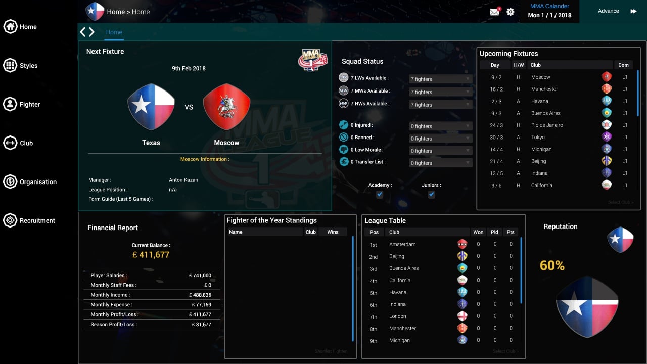 Интерфейс игры оптимизирован для PC и позволяет удобно управлять командой в режиме реального времени, просматривать детальные статистические данные, финансовые отчёты и прогресс бойцов через интуитивно понятные меню. Музыкальное сопровождение и звуковые эффекты создают атмосферу офиса менеджера и адреналиновой напряжённости спортивных соревнований.