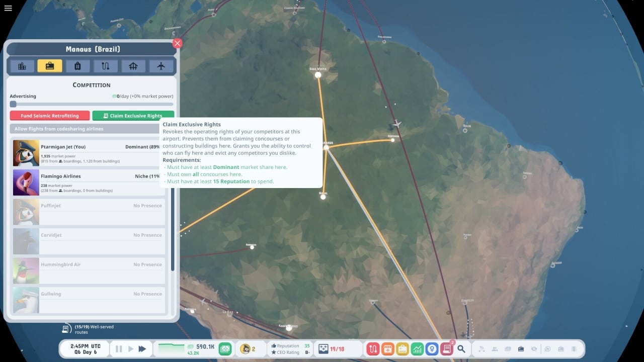 В Puffin Planes вы начинаете с небольшого аэропорта и одного самолёта, а затем расширяете сеть маршрутов по всему миру — от Москвы до Нью-Йорка, от Пекина до Сиднея и даже на марсианские колонии. Атмосфера игры максимально расслабляющая: приятная музыка, красивый 3D-глобус, idle-элементы пассивного дохода и стратегическое планирование рейсов. Механики просты и затягивают: проводите линии маршрутов, покупайте новые самолёты, улучшайте терминалы, анализируйте спрос пассажиров, конкурируйте с другими авиакомпаниями и открывайте футуристические технологии.