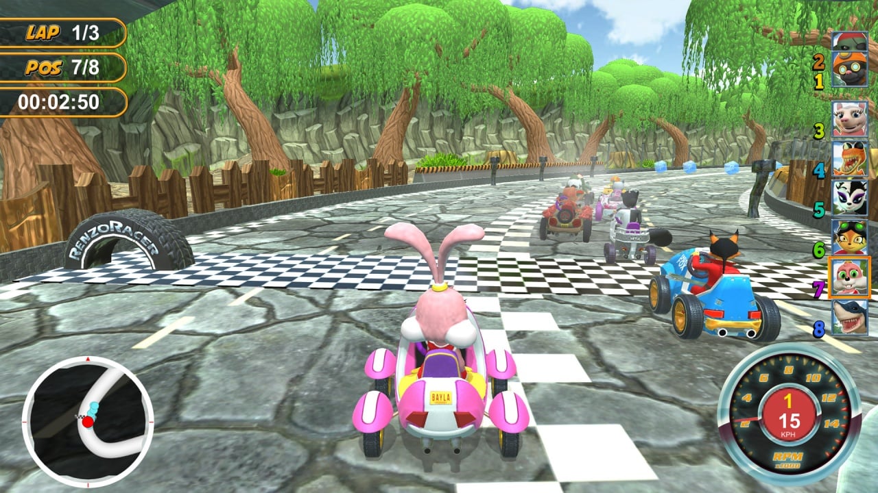 Графика Renzo Racer выполнена в ярком аркадном стиле с эффектными спецэффектами скорости, динамическими камерами и плавной анимацией машин, создавая ощущение драйва и скорости.