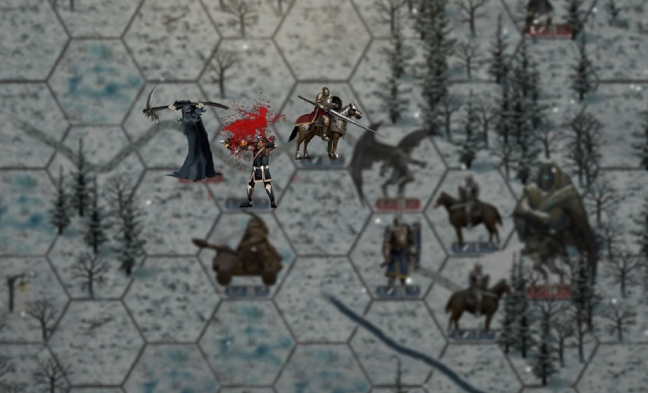 Атмосфера игры невероятно мрачная и напряжённая: кровавые битвы на фоне разрушенных замков, проклятые леса, туманные болота, осаждённые города и подземелья, полные ловушек. Каждый бой — это настоящее тактическое сражение на гексагональной карте: учитывайте рельеф, высоту, укрытия, дальность атаки, мораль войск и специальные способности героев.